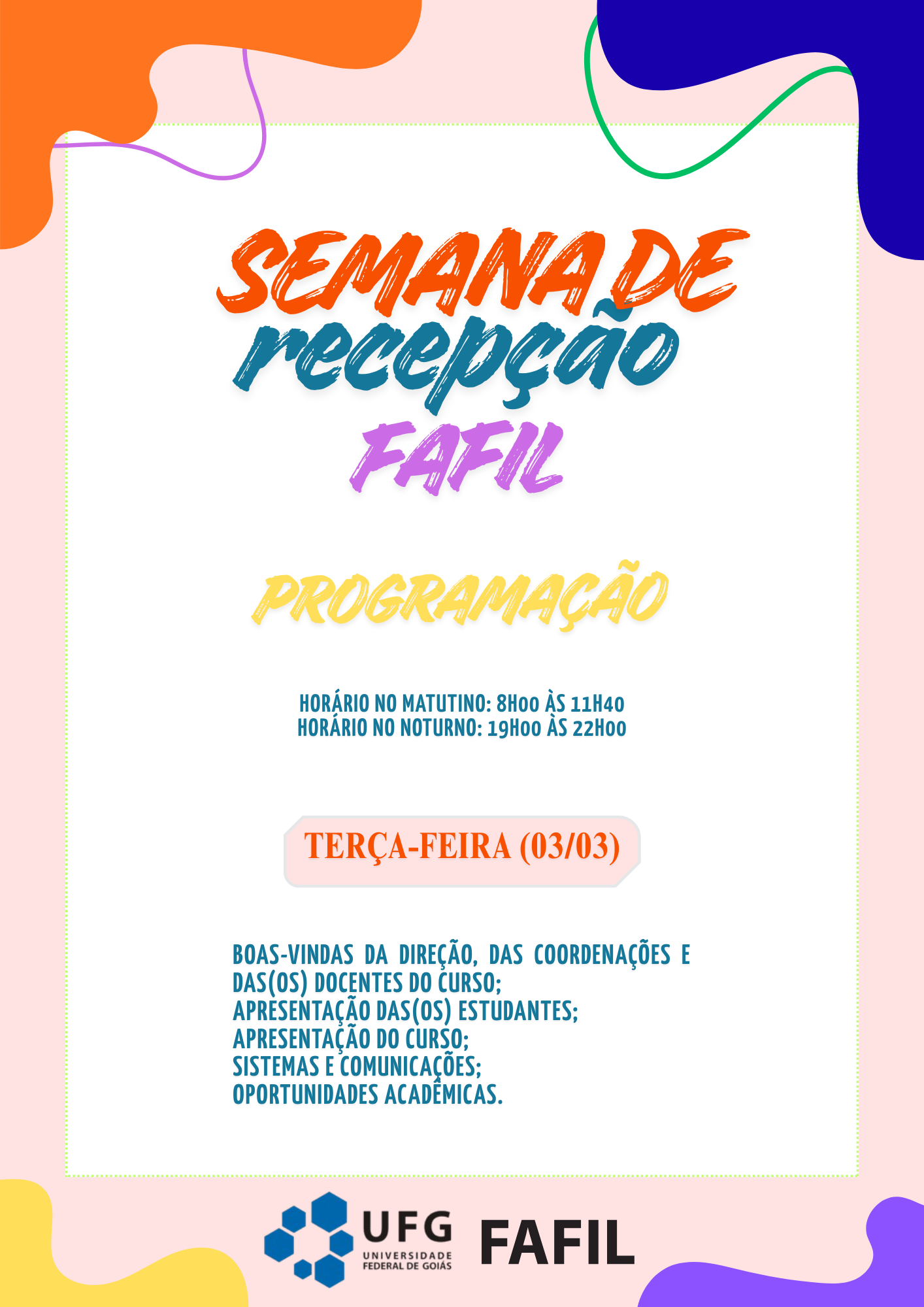 Fiquem atentas/es/os a programação da Semana de Recepção de Calouras/es/os da FAFIL 2026.1